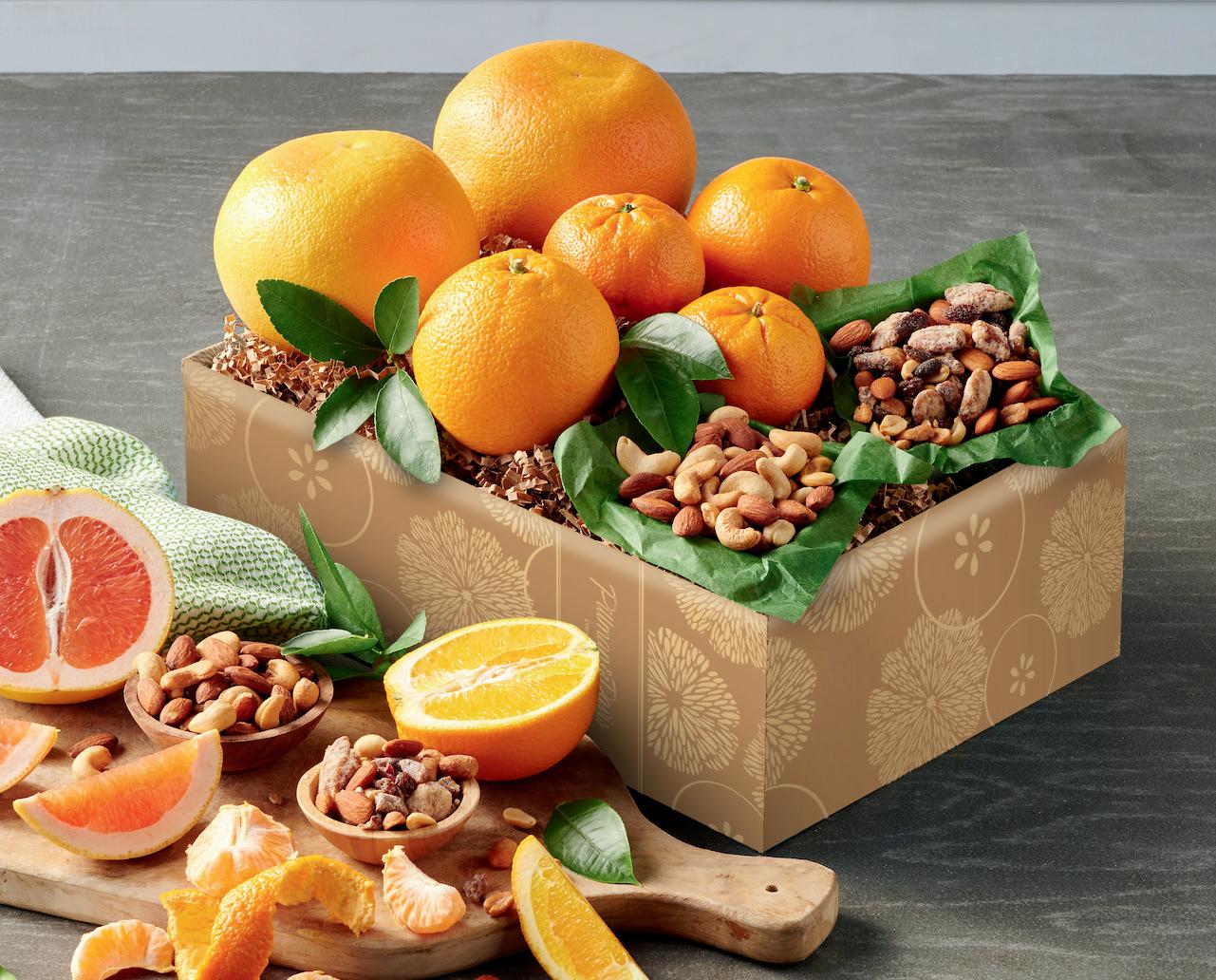 This healthy, delicious assortment contains two each of our sweet Ruby Red Grapefruit, seedless Navel Oranges and easypeel Clementines. Gourmet mixed nuts add savory crunch while our signature American-Grown Snack Mix is just the right amount of salty and sweet.