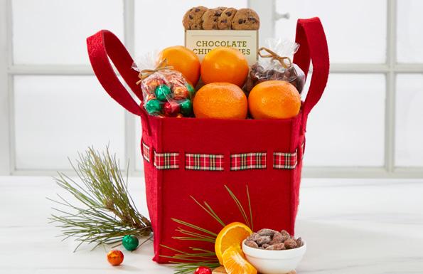 This variety basket, in our exclusive Holiday Grove design, delights fruit lovers with our signature grove-fresh citrus: Navel Oranges, Honey-Sweet Tangerines and Petite Navels. We top it off with Milk Chocolates, Peppermint Candy and Chocolate Chip Cookies. All in a re-useable tray that's sure to please everyone in the family.