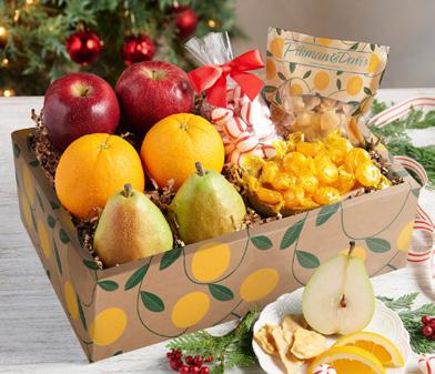 Two varieties of our great-tasting, premium-quality, fresh from-thegrove citrus along with a selection of sweet holiday treats presented in a reusable wood tray with handles is a sure way to make a special friend, family or business associates holiday extra-merry! Includes a juicy-sweet Rio Ruby™ Red Grapefruit, two seedless Navel Orange, gourmet Chocolate Chip Cookies, Honey-Roasted Peanuts, Peppermint Puffs and Foil-Wrapped Milk Chocolate Balls. (Available November through December.)