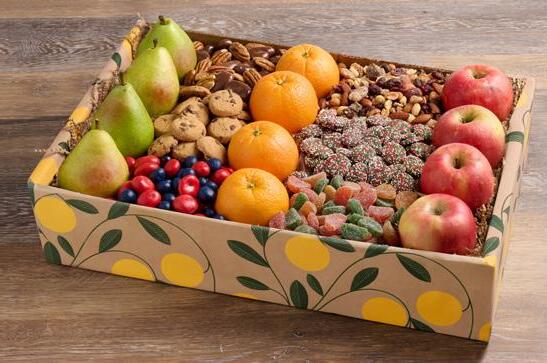 Gather your loved ones and prepare to feast! This impressive gift box delivers a variety of our most popular farm-fresh fruit plus premium sweets and treats for entertaining: smooth Gouda Cheese with crispy Olive Oil & Sea Salt Crackers; sweet & salty Peanut Brittle, Dark Chocolate Sea Salt Caramels, Chocolate-Covered Cherries, and Chocolate Coconut & Pecan Bites. (Available November through January.)
