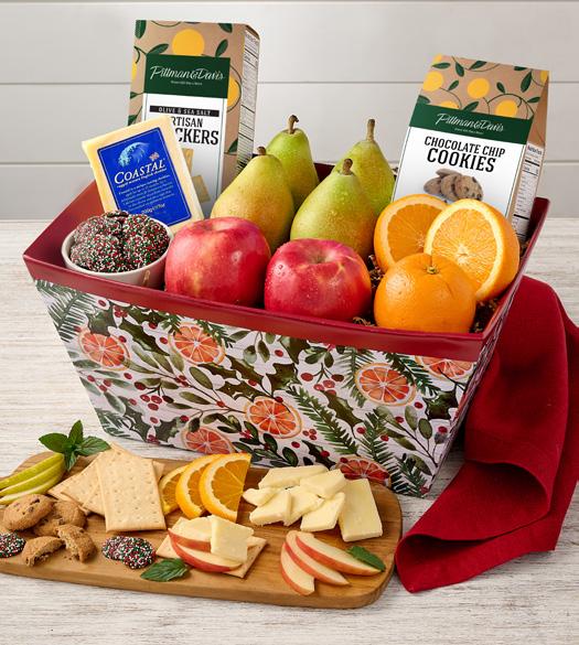 When loved ones receive this reusable gift basket tied with a festive tag, they're sure to have themselves a merry little Christmas! Two sweet Navel Oranges, 1 creamy King Comice Pear, and 1 juicy Starkrimson Pear plus an assortment of holiday treats like Chocolate Santas, Peppermint Puffs, Christmas Tree Pretzels, and Caramel & Pecan Popcorn adds extra indulgence. (Available November through December.)