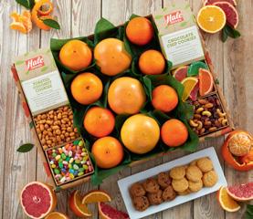 A generous portion of our grove-fresh fruit is paired with a variety of goodies sure to please everyone. Four Tangerines and four Navels with three Ruby Red Grapefruit are surrounded by two kinds of Cookies, Candy Fruit Slices, Jelly Belly® Beans, Honey Roasted Almonds and Fruit & Nut Snack Mix.