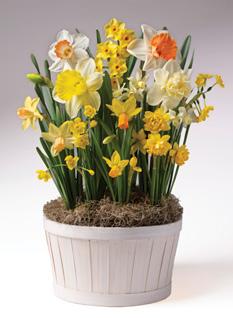 Pre-planted tulip and daffodil bulbs in a white woven basket gradually yield breathtaking blooms in shades of yellow, white, orange or pink. Perfect for bringing sunshine to indoor spaces!