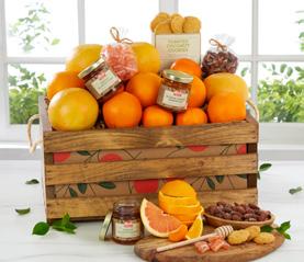 Old-world charm of citrus groves in a wood crate. We’ve collected some of our favorites to create a delicious, festive assortment ideal for sharing. Our grovefresh citrus is complemented by our Toasted Coconut Cookies, Orange Marmalade, Honey, Coconut Squares, Honey Roasted Almonds and a Milk Chocolate Orange.