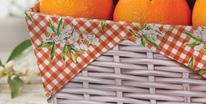 Fresh-picked seedless Grove Navel Oranges and Honey- Sweet Tangerines are packed with Toasted Coconut Cookies, Candied Fruit Slices and crunchy Honey Roasted Almonds in a reusable gift box depicting bees and blossoms on an orange-and-white checked gingham background. It’s like springtime in a box!
