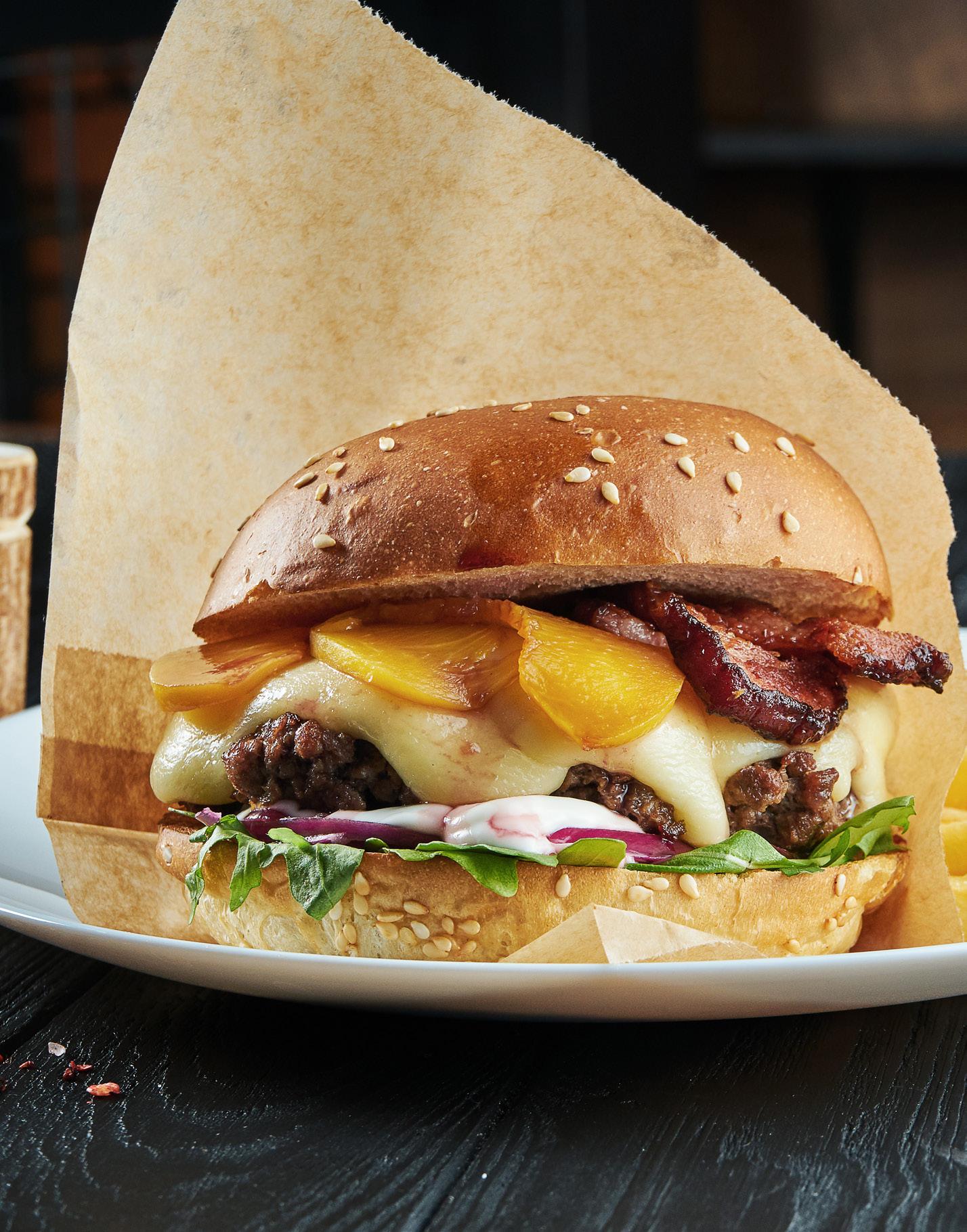 Grill patties with grill lid closed until beef is no longer pink in center (about 4 to 5 minutes each side). Top with cheese and serve on hamburger buns with onion mixture, bacon, peach slices, and basil leaves.