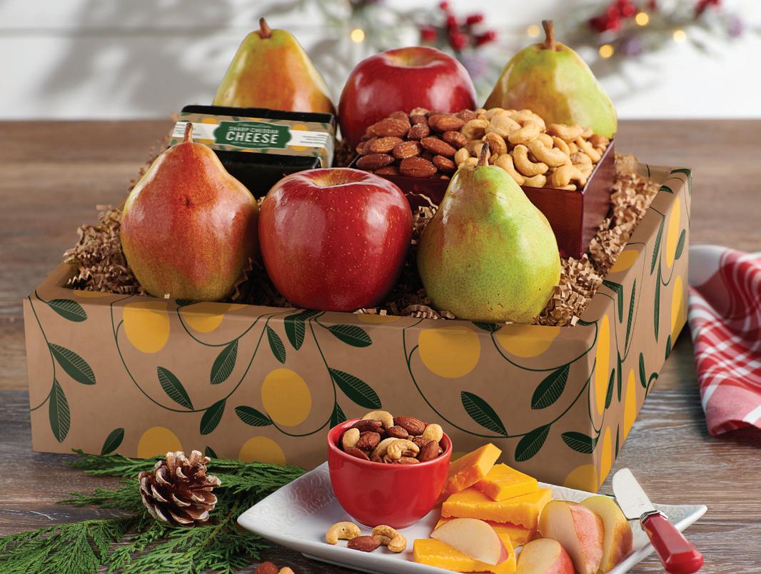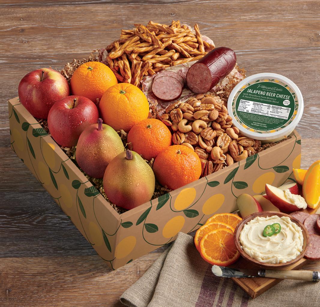 Just right for all your holiday gatherings! We've combined Navel Oranges, Fuji Apples, King Comice Pears, Clementines, Apple Summer Sausage, Jalapeño Beer Cheese (perfect for dipping!), Butter Braided Pretzels and Cashew and Pecan Mixed Nuts in a mouthwatering assortment that's sure to be the hit of your holiday spread. (Available November through January.)