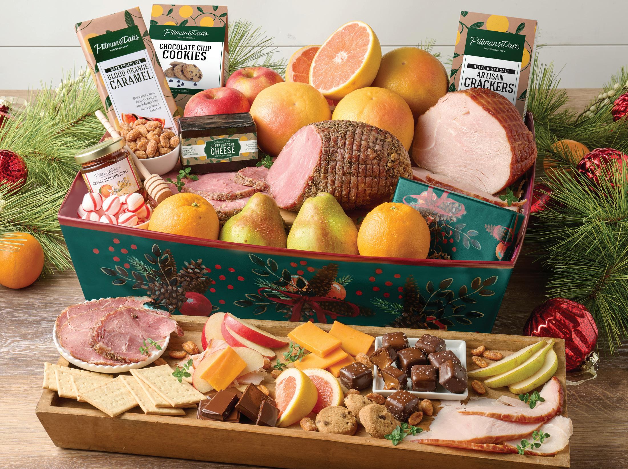This gift will fill their feasting table with an array of sumptuous gourmet delights! Our exclusive holiday gift basket arrives packed with a delicious, fully cooked Boneless Smoked Peppered Ham and Smoked Boneless Turkey Breast to serve as a main dish, while a Sharp Cheddar cheese with crispy Olive Oil & Sea Salt Crackers serve as a side. For dessert: a variety of sweet citrus and orchard fruits, along with our Orange Blossom Honey (wooden dipper included!), decadent Dark Chocolate Blood Orange Caramel Bar, Dark Chocolate Sea Salt Caramels and refreshing Peppermint Puffs. (Available November through December.)