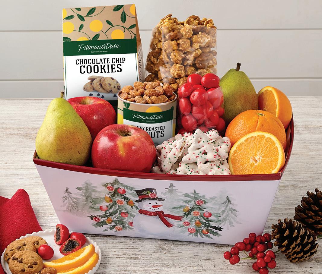 Share these glad tidings with everyone! Our festive snowman gift box holds 2 each sweet, healthy Navel Oranges, Mini Fuji Apples, and Princess Pears, plus a sweetly snackable mix of Caramel & Pecan Popcorn, Chocolate Chip Cookies, Honey-Roasted Peanuts, Chocolate-Covered Cherries and Creamy White Christmas Tree Pretzels. (Available mid-November through January.)