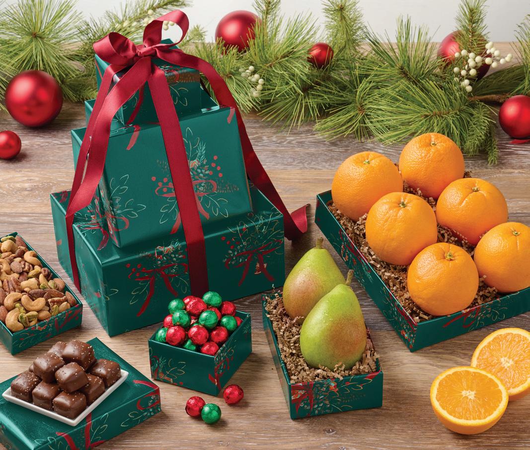 Five gift boxes in our exclusive holiday design, each with a tasty surprise: seedless Navel Oranges, mild King Comice Pears, decadent Dark Chocolate Sea Salt Caramels, crunchy Deluxe Mixed Nuts and festive Foil-Wrapped Milk Chocolate Balls. Artfully arranged and finished with a red satin ribbon, this tower of treats is sure to surprise and delight! (Available November through December.)