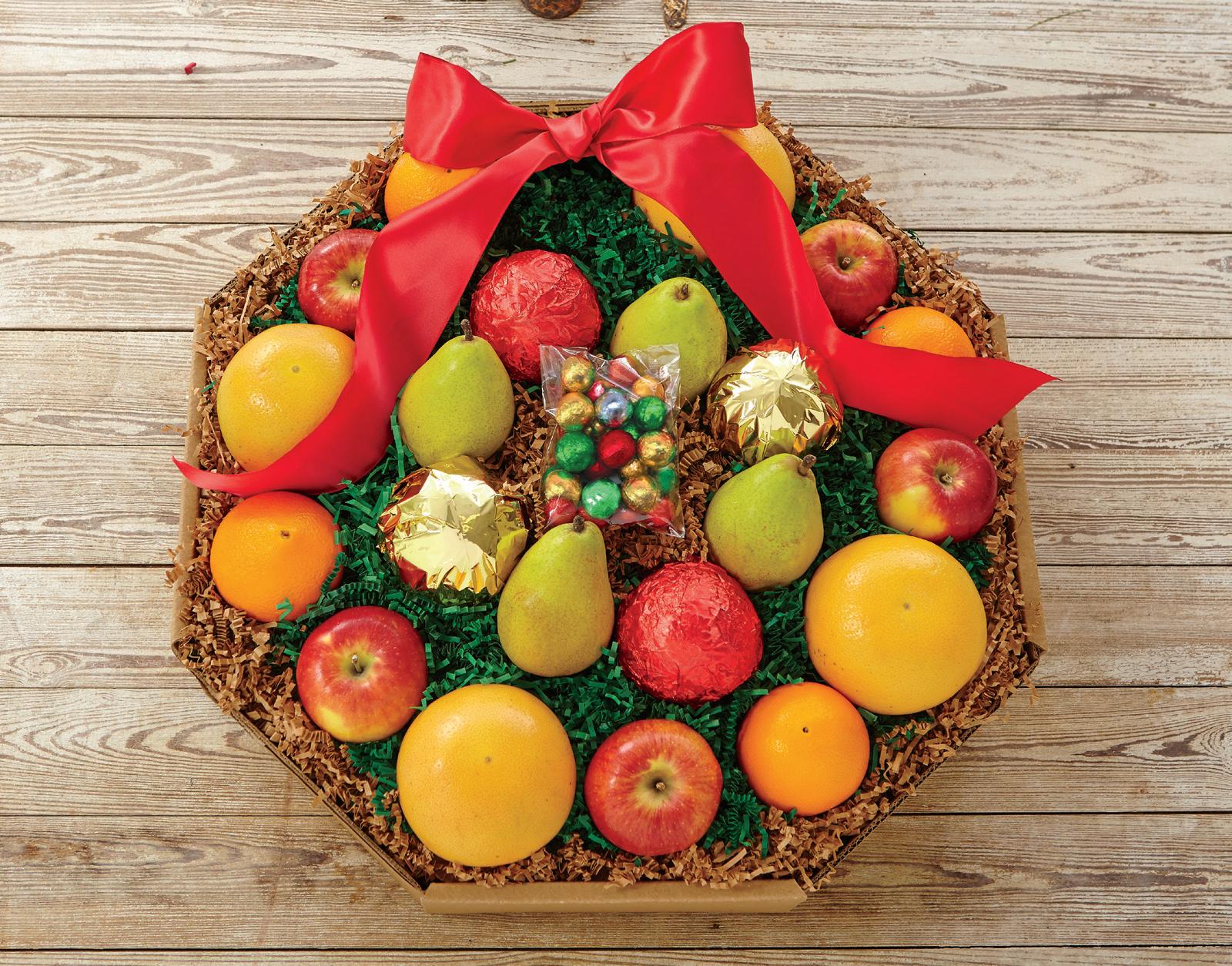 A festive favorite that tastes as good as it looks! This impressive wreath includes 4 Ruby Red Grapefruit, 8 Navel Oranges, 4 D’Anjou Pears, 5 Apples, and foil-wrapped Milk Chocolates in the center. Tied with a red bow and ready to gift. The smaller version includes a hand-picked mix of Pears, Grapefruit, Navels, Apples, and Milk Chocolates—perfect for neighbors, teachers, or smaller households.