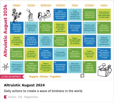 Our latest student Voice meeting was held online on 19th July which was very well attended. We discussed many items on the agenda, one being the theme for The Recovery College Extra. We watched a short video clip relating to a program that has been created by Action for Happiness, called 10 days of Happiness. Action for Happiness was created through the pandemic and has many areas to the platform. 10 days of happiness is free to sign up to and participate in. Consisting of daily 2 minute videos, sent to you either by text or email, relating to key areas of wellness. There is an area for you to participate in as well.