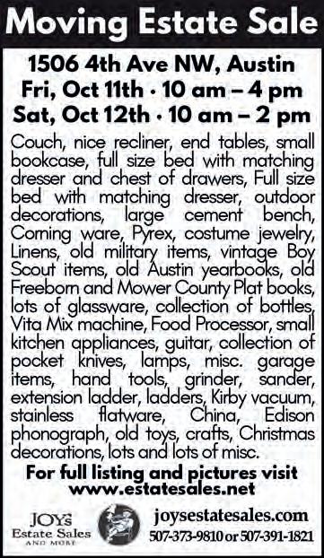 609 13th AVE SW, AUSTIN, October 11th & 12th Fri: 8am-4pm, Sat: 8am-1pm TAG SALE! Prices marked in home and garage. Many household items and garage items!