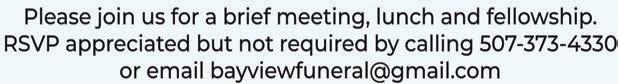 Please join us for a brief meeting, lunch and fellowship. RSVP appreciated but not required by calling 507-373-4330 or email bayviewfuneral@gmail.com