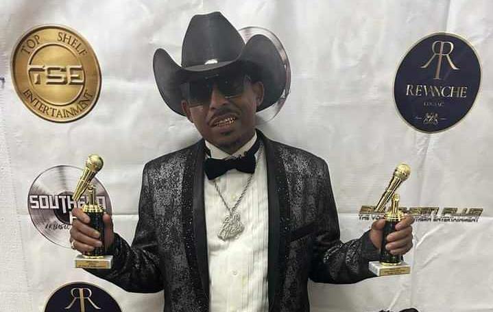 DUBBA SHOTTZ POSES WITH HIS TWO AWARDS ON THE RED CARPET