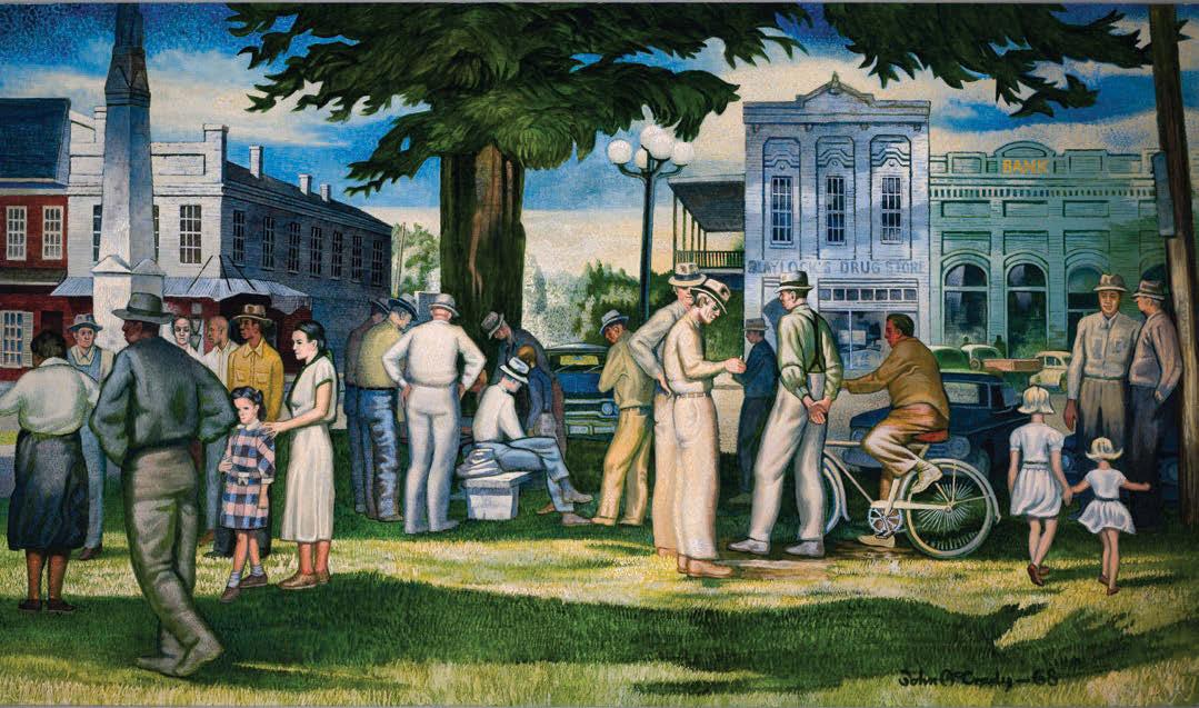 The Square depicts the patch of grass surrounding the courthouse at the center of his former home, Oxford, Mississippi. With dynamic compo sition and vivid yet serene colors, McCrady depicts a normal day in a rural southern town, with people gathering in front of the local busi nesses, a scene that is still common in Oxford today. While his subjects were often mundane, they depict the
