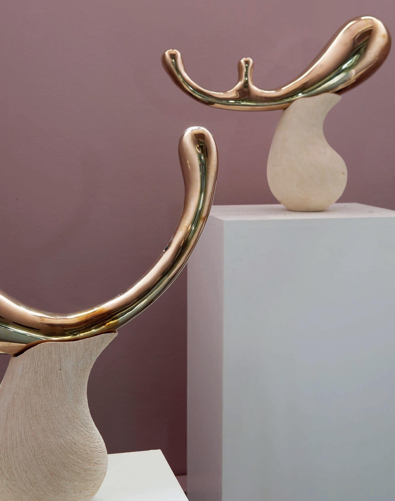 Some of the pieces in the lyrical new Tide candelabras collection combine cast and polished bronze sections with moulded, scarified clay elements.