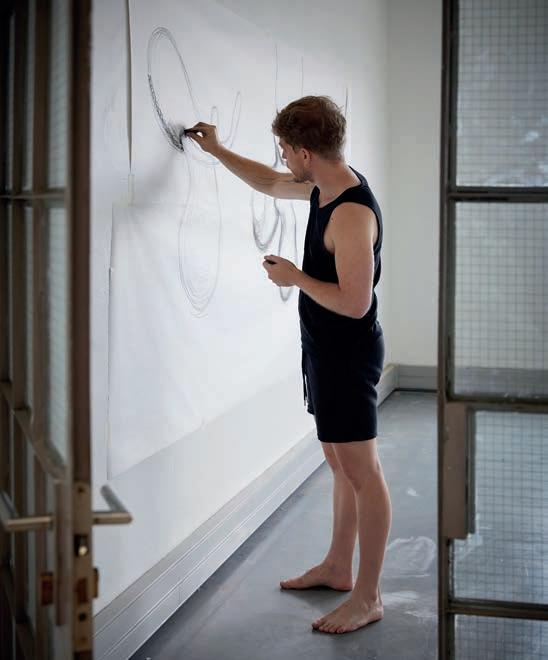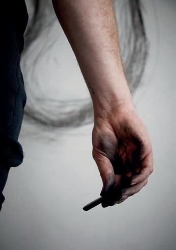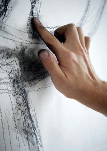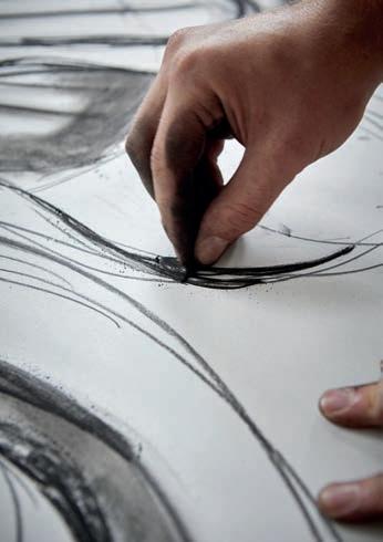 Jan Ernst begins his large installations with expressive charcoal sketches, which are scanned and transformed into digital 3D models. These models guide the creation of hand-sculpted ceramic pieces, often incorporating lighting. Once fired and glazed, the elements are assembled on the wall, echoing the energy of the original drawings.