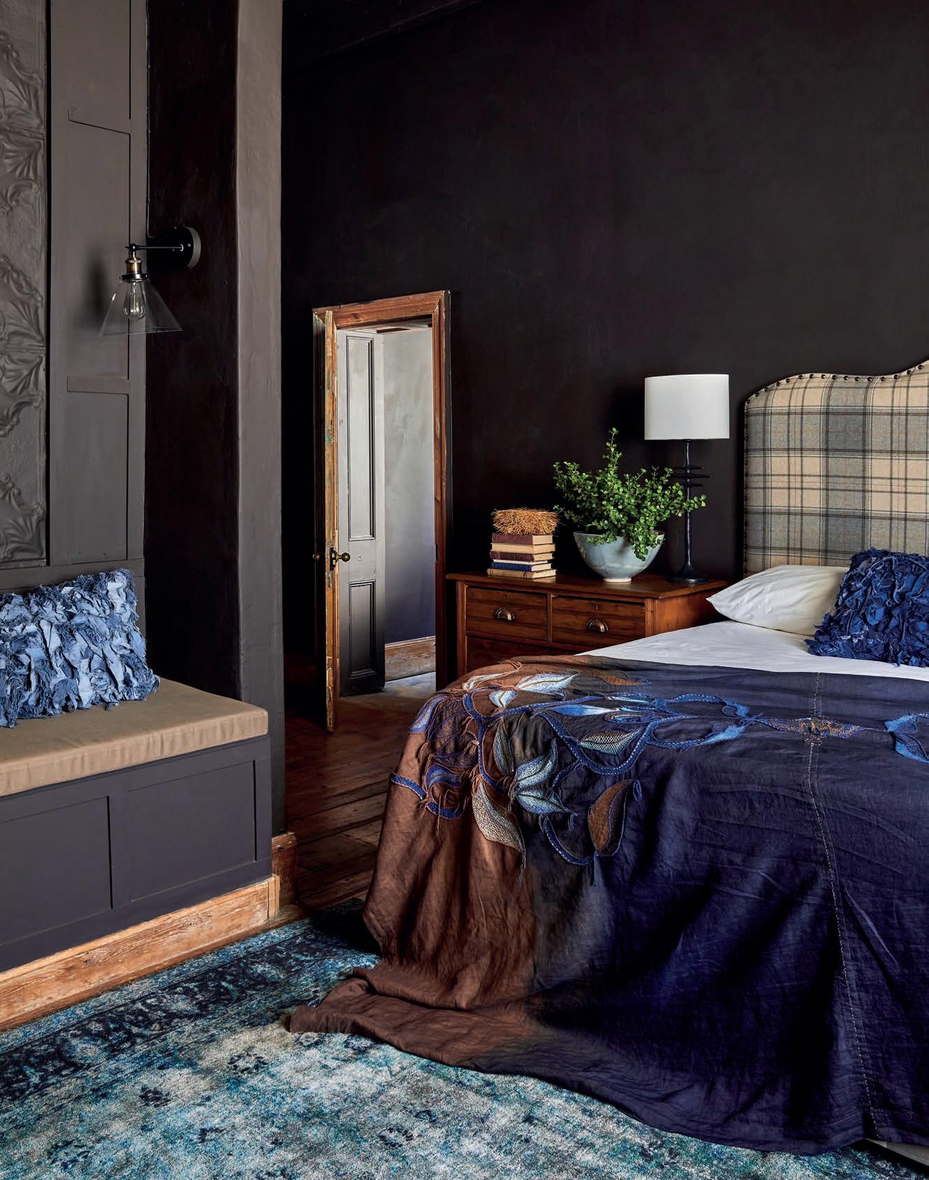 The main bedroom is serene and textural, with a handmade bedspread by Philip van Staden that picks up on the room’s earthy palette. “I told him the colours and feel I was after, and he just got it,” says Jan. The deep brown walls and soft bedding make the space feel cocooned.