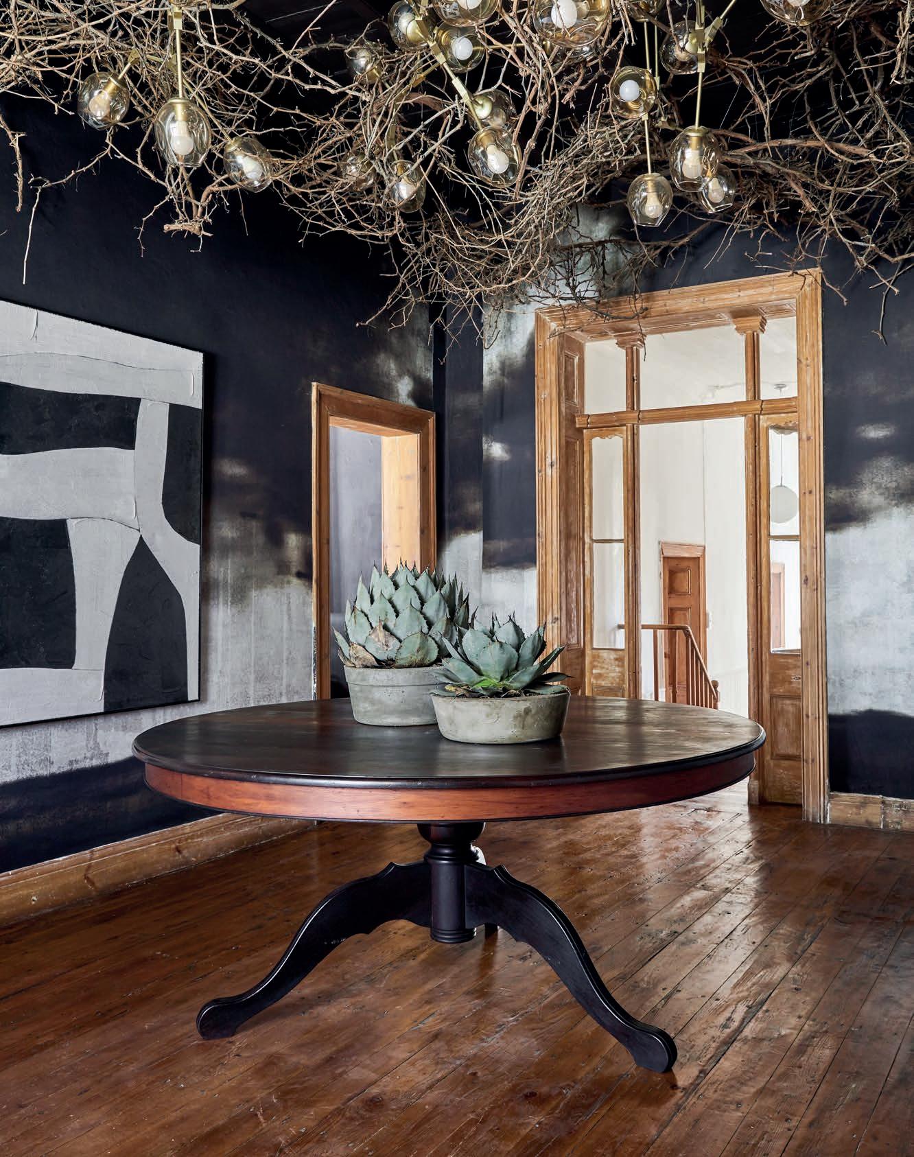 Then you step inside and everything shifts. The foyer is dark and dramatic. A suspended installation made from twisted vine salvaged from the garden hovers above a vintage table. Four chandeliers are wrapped around the vine like a sculptural nest. “It sets the tone,” Jan explains. “The house is about contrast. Old and new, light and shadow.”