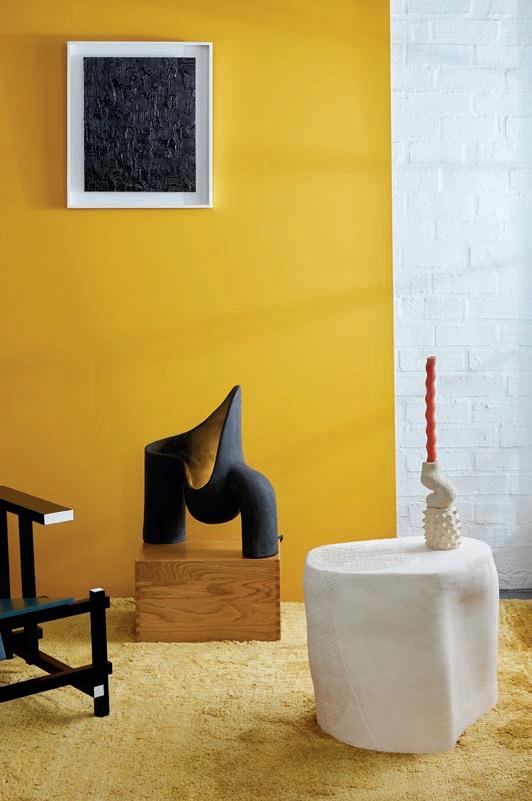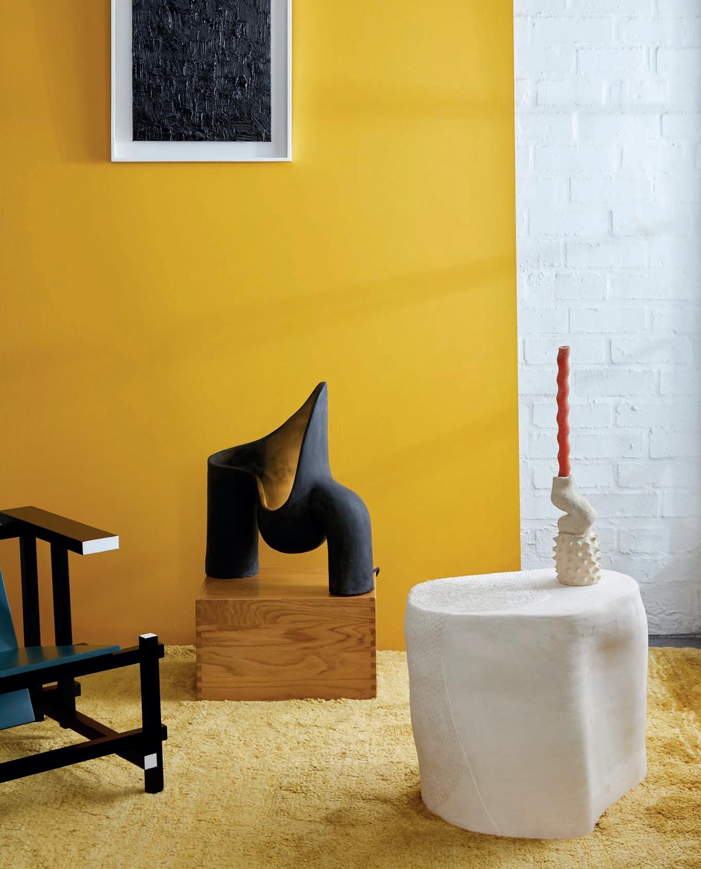 Line and texture are both essential elements of Jan’s work: his curvaceous ceramic forms are beautifully set off by linear modernity of a vintage Gerrit Rietveld chair and plush rug here. The artwork on the wall is by Marolize Southwood, with a Womb table lamp on the wooden plinth and a Twiggy candle holder on the Some of the Parts ceramic side table. The orange Screwed candle is by Okra.