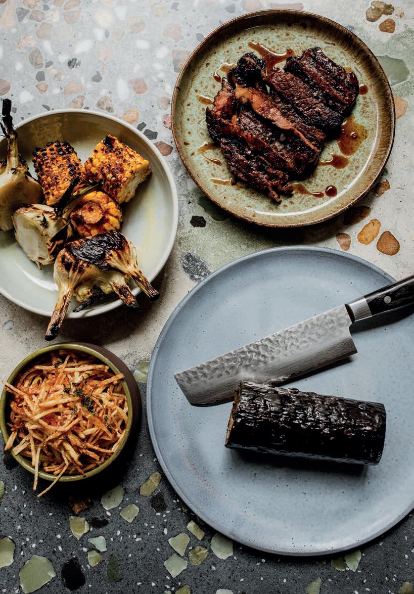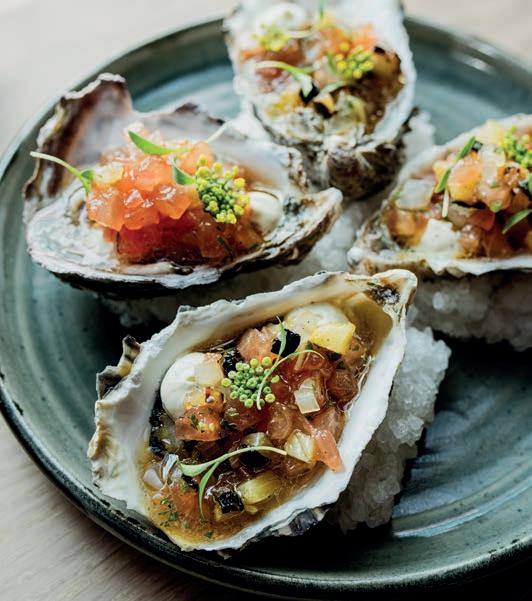 Above Galjoen, Seebamboes takes this philosophy further. The restaurant explores the interplay between land and sea, o ering a tasting menu experience that ri s on gastronomic nostalgia in a contemporary reimagining of what ‘surf and turf’ can be. And what it should be: playful, celebratory, delicious. The menu blends ingredients in unexpected ways: wagyu brisket with kelp spaghetti and snoek soup with spicy kimchi undertones. The name, Afrikaans for ‘sea bamboo’, reflects the restaurant’s use of local kelp and its role as a symbol of balance between ocean and earth. Seebamboes is wild, playful and quietly radical in how it treats ingredients and flavour.