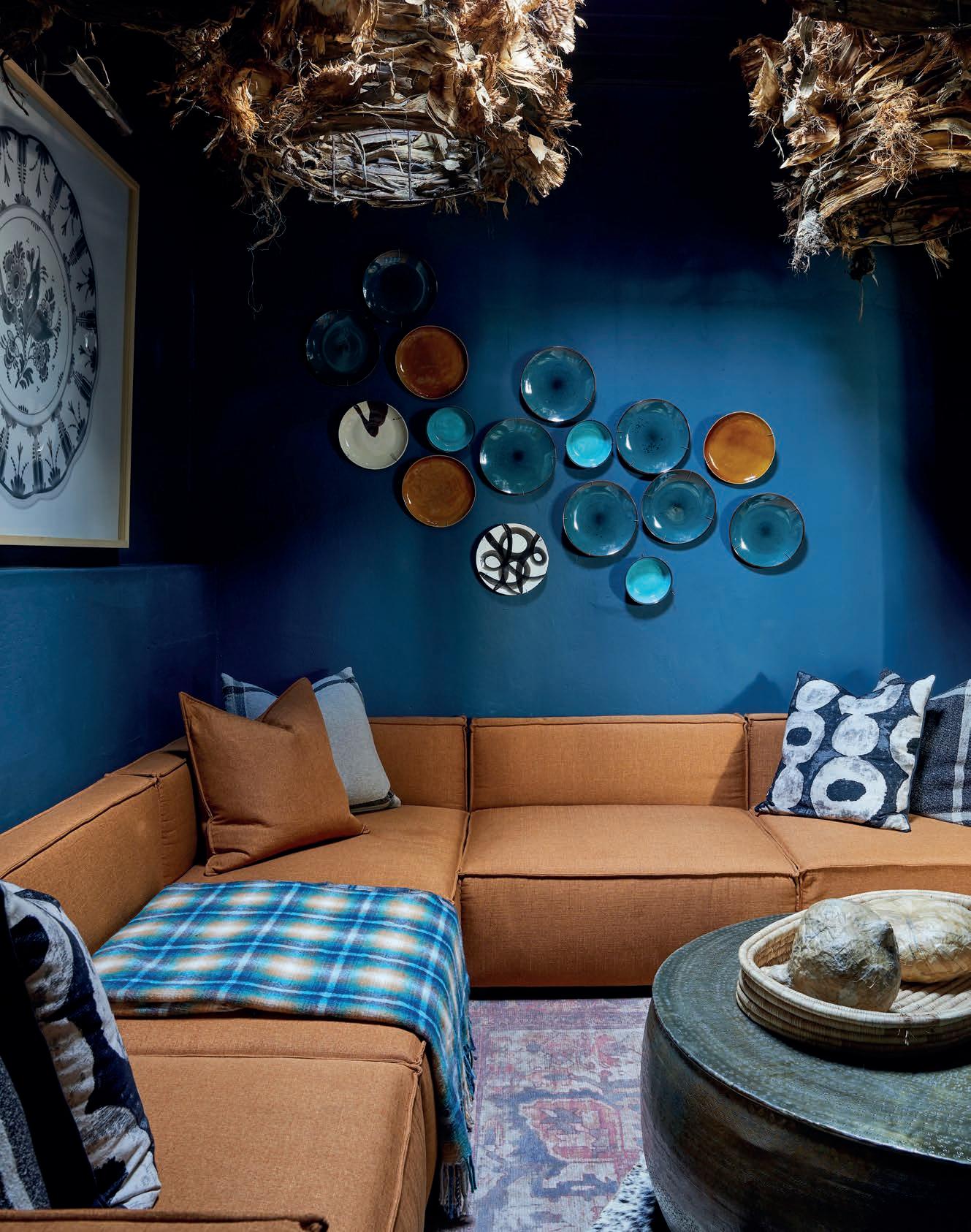 The blue room marks a bold shift in the home’s palette. Walls, shelving and even the ceiling are painted in rich cobalt, turning the space into a fully immersive zone. Custom chandeliers made from dried cacti leaves, hang above, drawing the eye upward and reinforcing the room’s sense of scale. Jan collected the leaves and wove them around a steel frame to form this sculptural piece.
