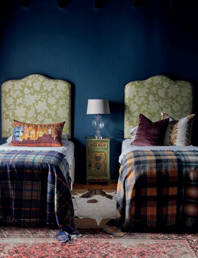 In this twin bedroom, Jan played with scale using oversized, curved headboards to counter the height of the ceiling. Fabrics are mixed intentionally: bold checks, abstract weaves and soft cottons in muddy pinks and olives.
