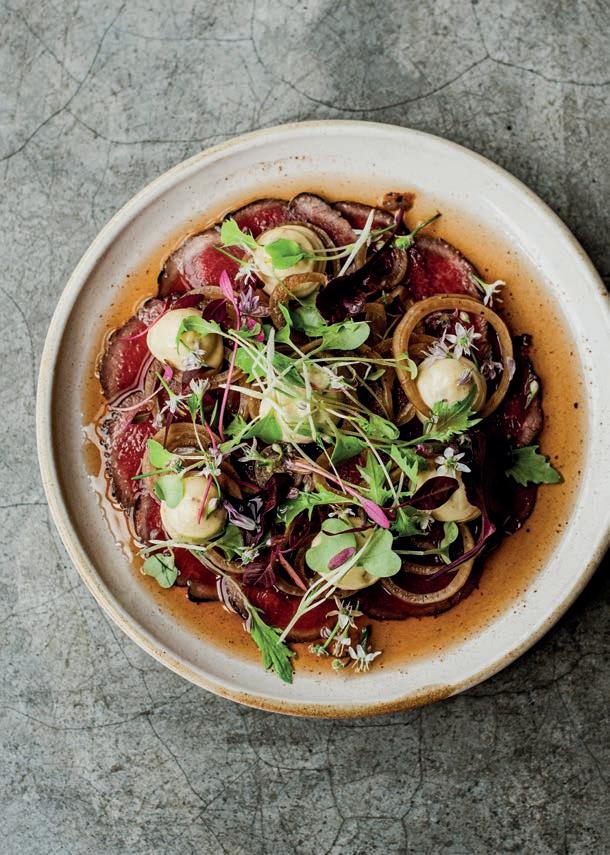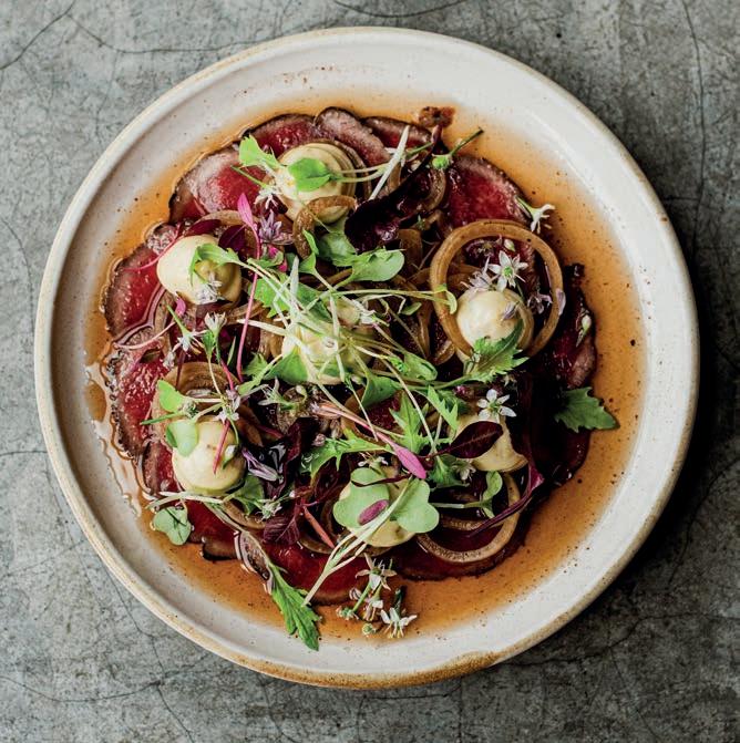 eil and Anouchka’s journey began during their formative years in the industry, both working under the mentorship of chef Michael Broughton at the esteemed Terroir restaurant in Stellenbosch. Terroir, known for its rigorous standards and classical approach, was both a crucible and a classroom. In fact, it was here that Neil met his future wife, who was managing the front of house, and where the foundations of his partnership with Anouchka were laid. Their first professional collaboration began at a small bistro in Durbanville called Arugula, where Neil was running the kitchen and needed some help. Anouchka, with her characteristic calm and precision, was the obvious choice. Despite already knowing her well from their days at Terroir, Neil asked her to send through her CV out of formality. As soon as he hung up the phone, he laughed, realised how unnecessary it was and called her back immediately to o er her the job. It was a natural fit from day one and that early partnership laid the groundwork for the seamless working dynamic they share today. Their collaboration is marked by a unique synergy. Disagreements are rare and when challenges arise, it’s never Neil versus Anouchka but rather Neil and Anouchka against the problem. This unity extends to their broader team, fostering an environment where creativity thrives and egos take a backseat. Neil, who feels he had to teach himself to be creative, and Anouchka draw inspiration from nostalgia and family traditions, reimagining them through a contemporary lens. Their culinary philosophy is inclusive, embracing techniques and flavours from across the world, yet grounded in a commitment to local, high-quality ingredients.