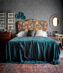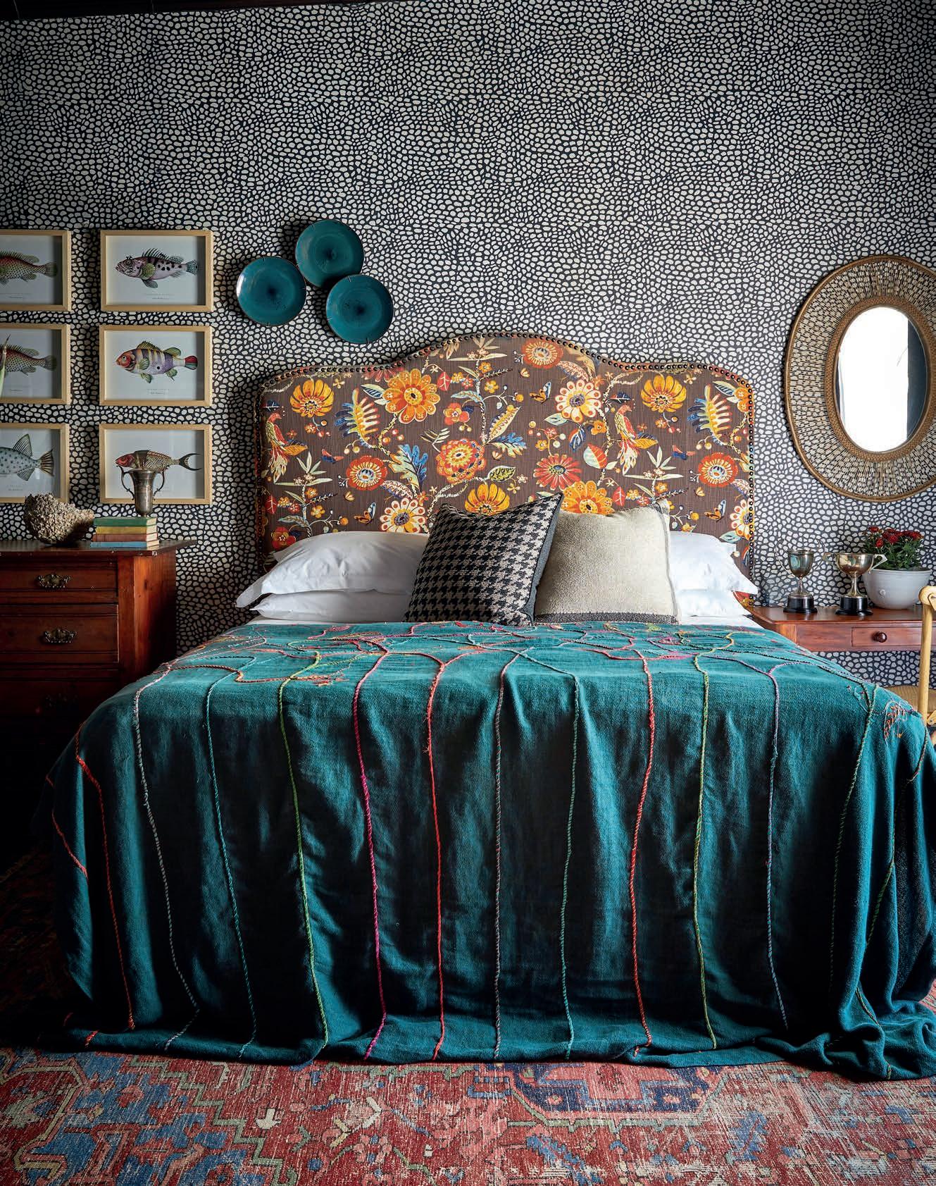 In this guest bedroom, Jan let loose with pattern and colour. The wallpaper - a graphic print that resembles guinea fowl feathers - sets the tone, while the bedspread, plates and fish prints bring in oranges, greens and playful contrast. The bedspread, custom-made by Philip van Staden, reads like a tapestry.