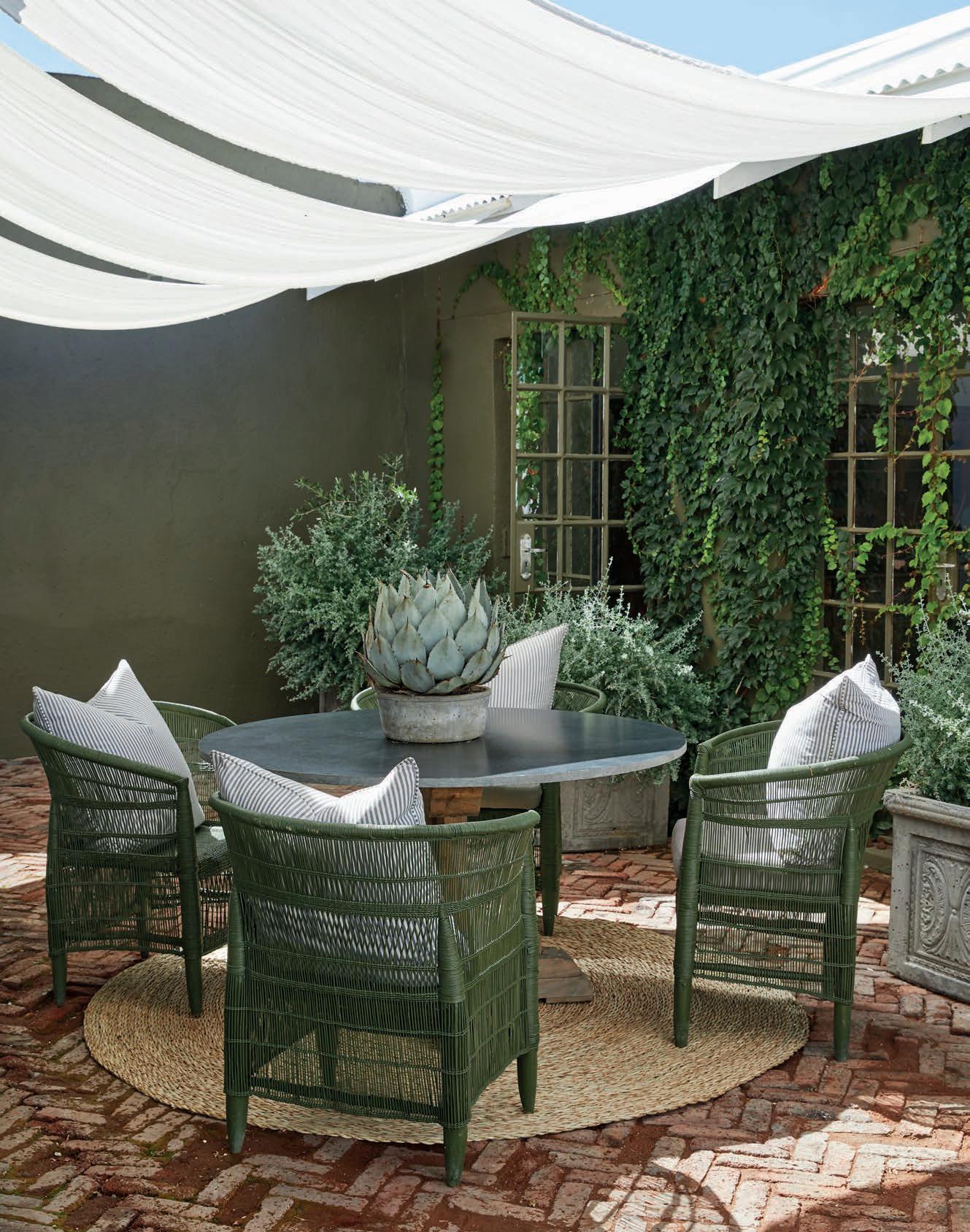 A shaded seating area on the garden terrace is simple but atmospheric. Jan hung oversized panels of white fabric between posts, creating dappled light and giving shade and a softness to the brick underfoot. Table, Nook; chairs and rattan rug, Malawian Wicker.