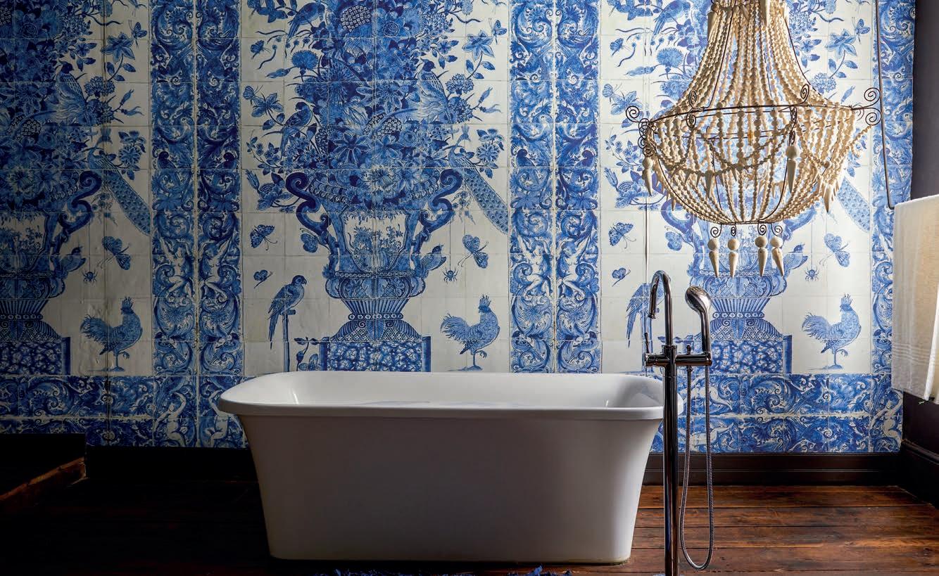 Opposite: In the en suite bathroom, Jan chose a blue-and-white Delft-style wallpaper by Cara Saven as the defining feature. The rich blue-and-white pattern isn’t just a visual choice - it ties the room to Karoo heritage, referencing the ceramics that once lined kitchens and cupboards in homes like this one.