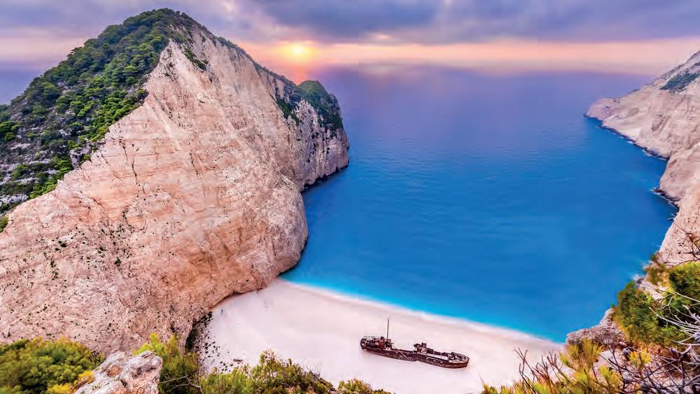 Greece boasts some of the world’s most beautiful beaches, and if you’re after sun and sand, you won’t struggle to find a suitable spot, especially if you explore the islands o the mainland. One of the most photographed beaches in the country is Navagio in the northwest of Zakynthos island, which is accessible only by boat and whose setting is characterised by turquoise water and dramatic white limestone cli s.