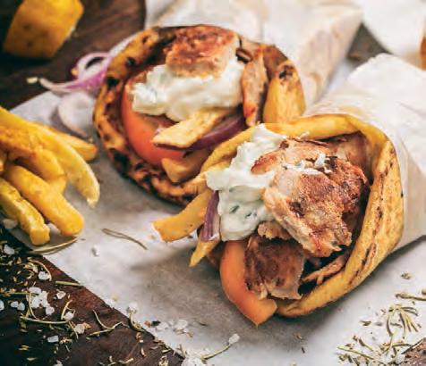 Greek food is well-known the world over, and for good reason. Perhaps one of the most loved is the kebab, also known as gyros or souvlaki, which is spit-roasted meat placed into pitas with all the trimmings, or served on a stick, and makes great on-the-go street food. Other impossible-to-resist snacks include saganaki (deep fried cheese), sfougata (fried cheese balls), revithokeftedes (fried chickpea balls), and dolmathakia (grape leaves stu ed with rice, pine nuts, and fresh herbs).
