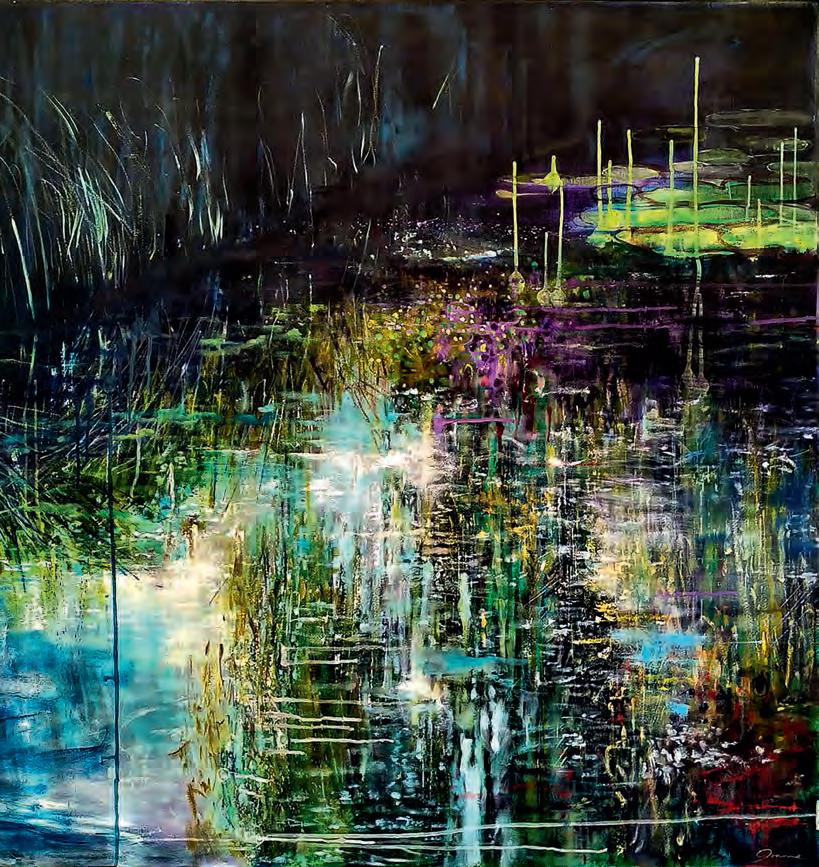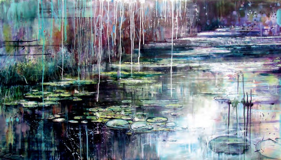 Joanne aims to reflect the human experience through landscape in her work, and her latest pieces feature scenes of water and its reflective qualities. Her new collection is deeply inspired by artists like Claude Monet and Cy Twombly — her style is expressive, and she makes use of gestural brushwork to create her visual studies in water.
