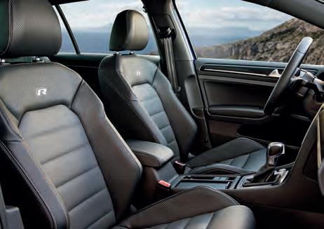 tailpipes have been strategically placed further out to the side of the car to highlight a wider appearance. Fine details such as Matte Chrome (or as an optional Carbon) exterior mirror housing caps lend a strong sporty feel to the car. This is all driven by 19-inch wheels. The Golf R is o ered in the following colours: Tornado Red, Pure White, Atlantic Blue Metallic, Indium Grey Metallic, Deep Black Pearl E ect; Oryx; White Mother of Pearl E ect and the classic Lapiz Blue Metallic paint finish.