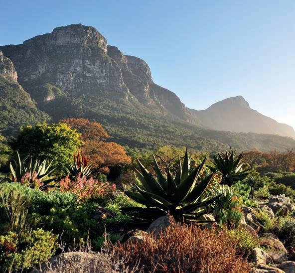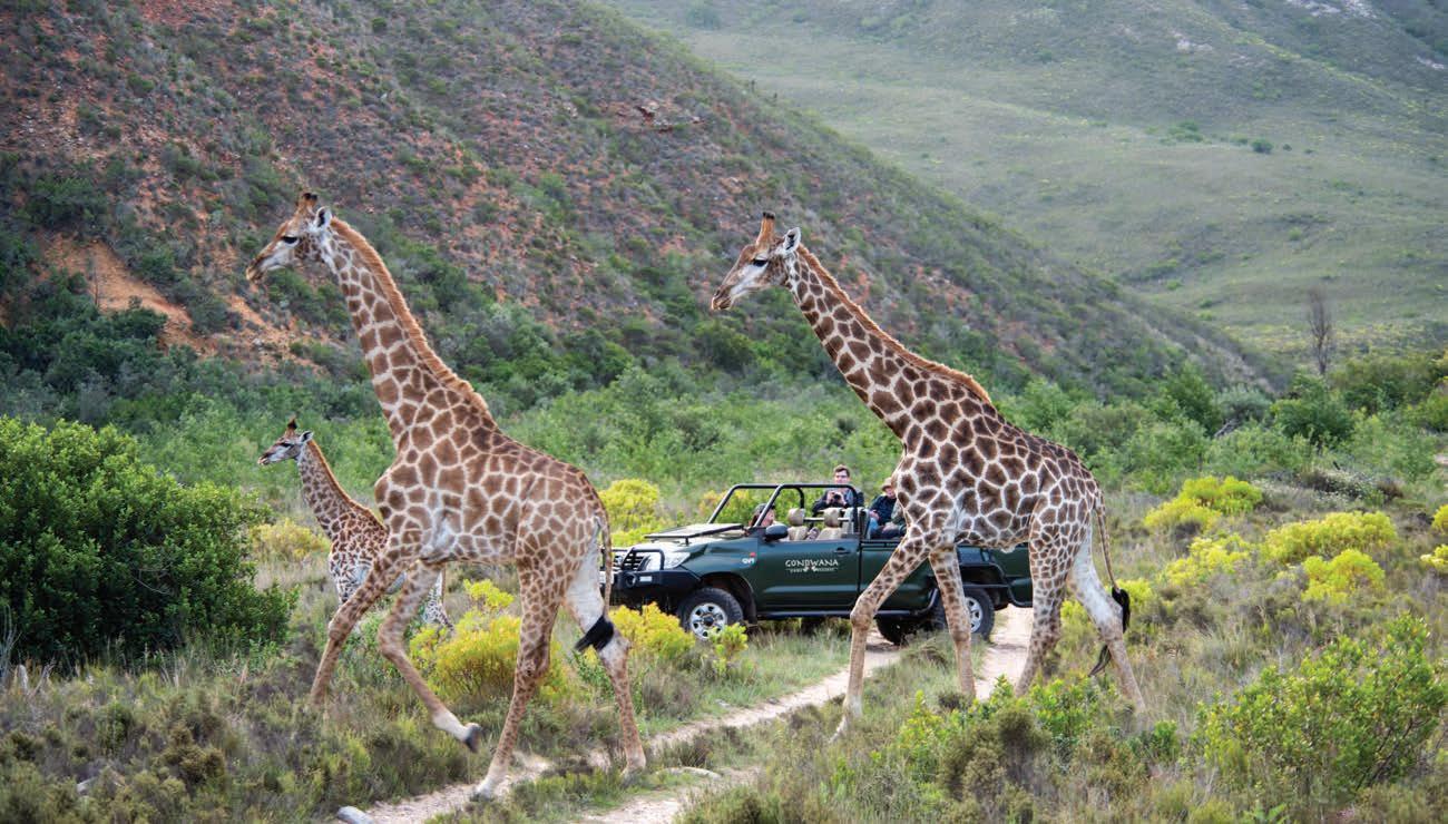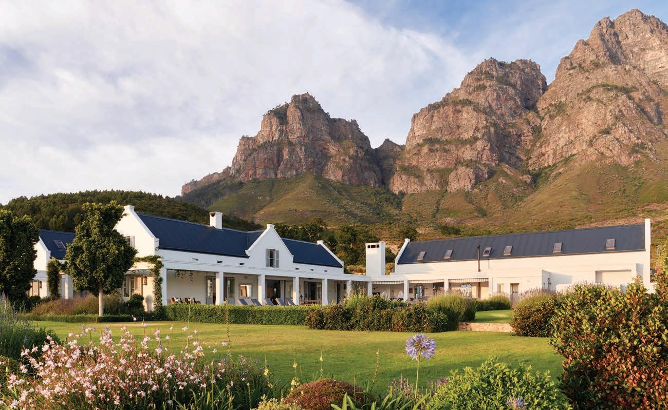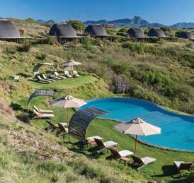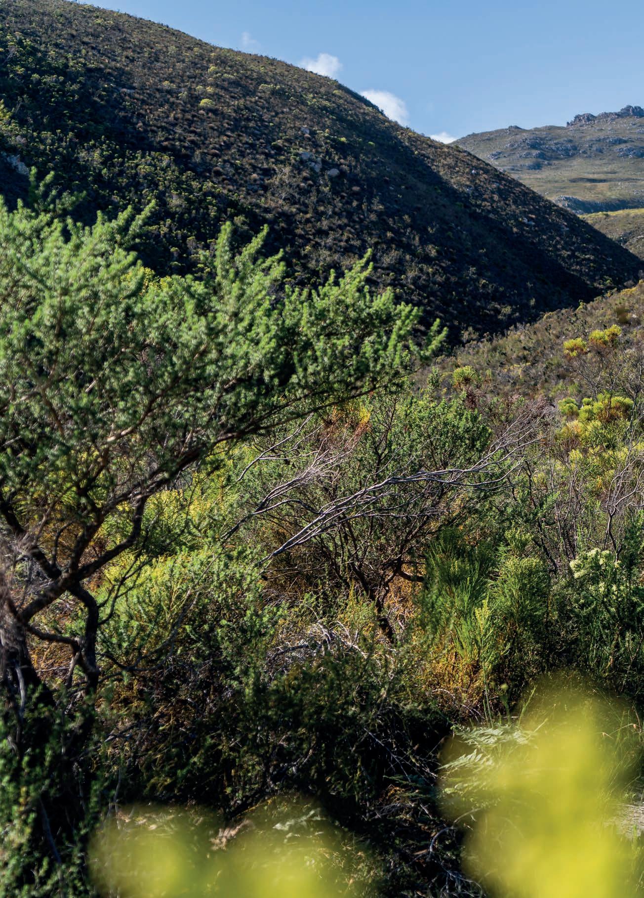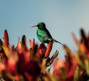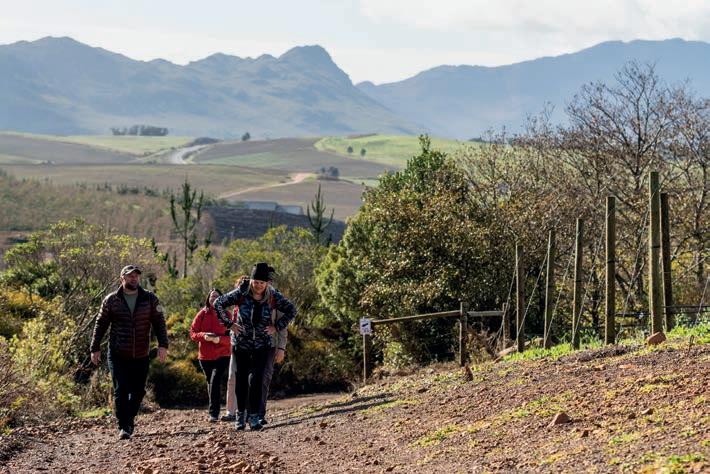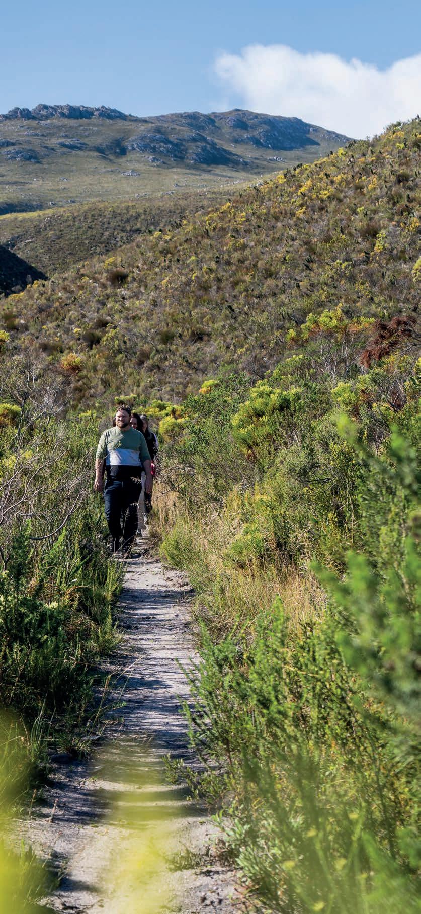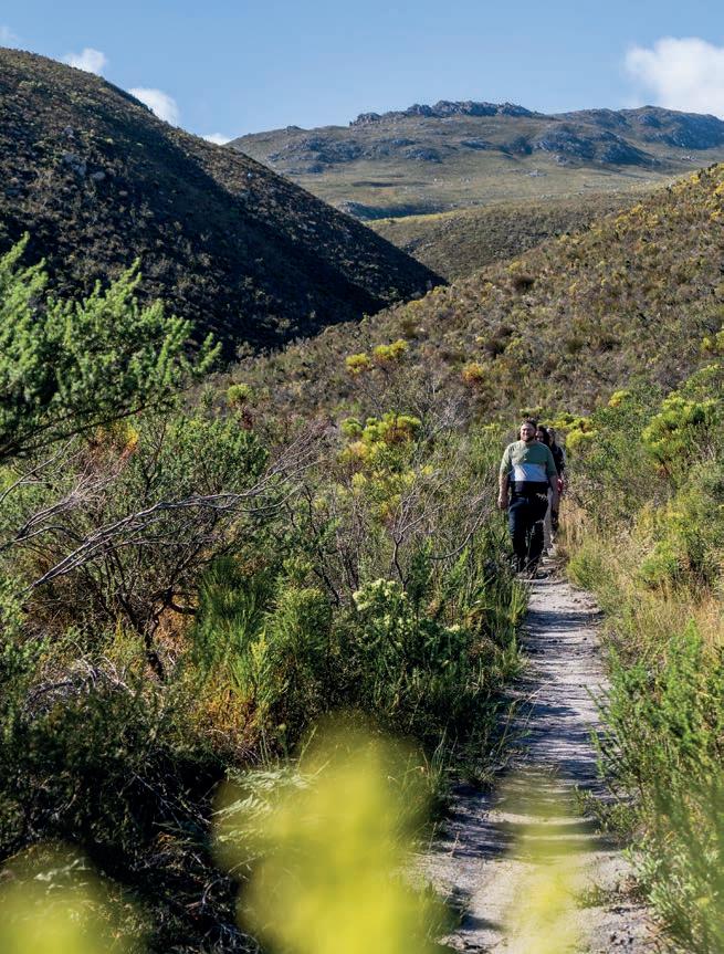 Last but certainly not least, is the 2.3 km, 1.5-hour trail in De Bos wine estate in the Hemel-en-Aarde valley. This glamtrail, designed by legendary local botanist, Frank Woodvine, is centred around the rich diversity of fauna and flora found on the estate and o ers sweeping views of the coast, ending with a picnic and wine at the Framehouse, a permanent glamping tent on the estate.