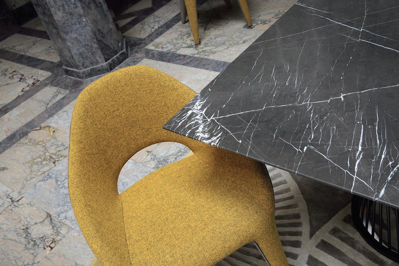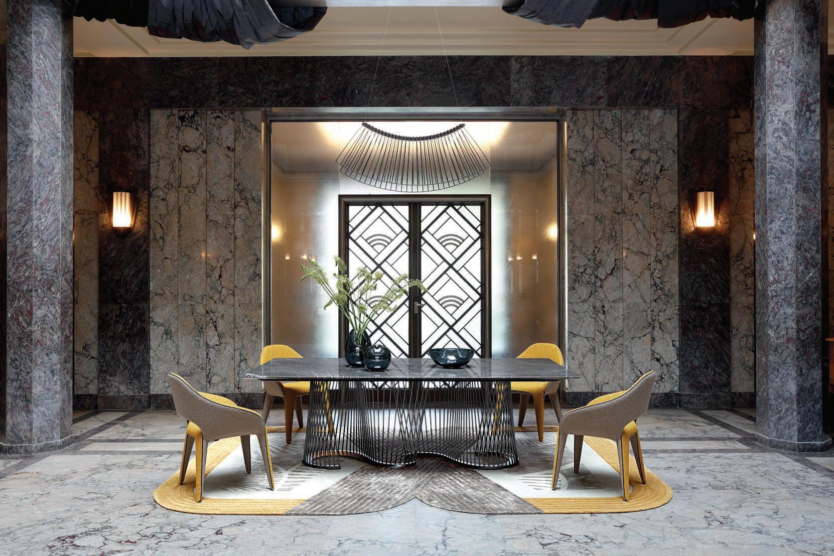 Serpentine Dining table, marble top, designed by Fabrice Berrux. Frontline Chairs, designed by Antoine Fritsch & Vivien Durisotti. Parabola. Suspension, designed by Cristián Mohaded. Sushi. Rug, designed by Messieurs.