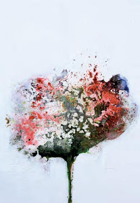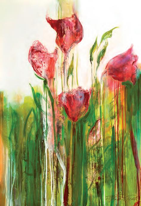 Her eclectic/abstract style sees her using a large array of materials in her paintings, including oil paint with ink, glued surgical gauze, mineral sands and various textured papers. Her latest masterpieces show off a florallike inspiration and bursts with bright colours.