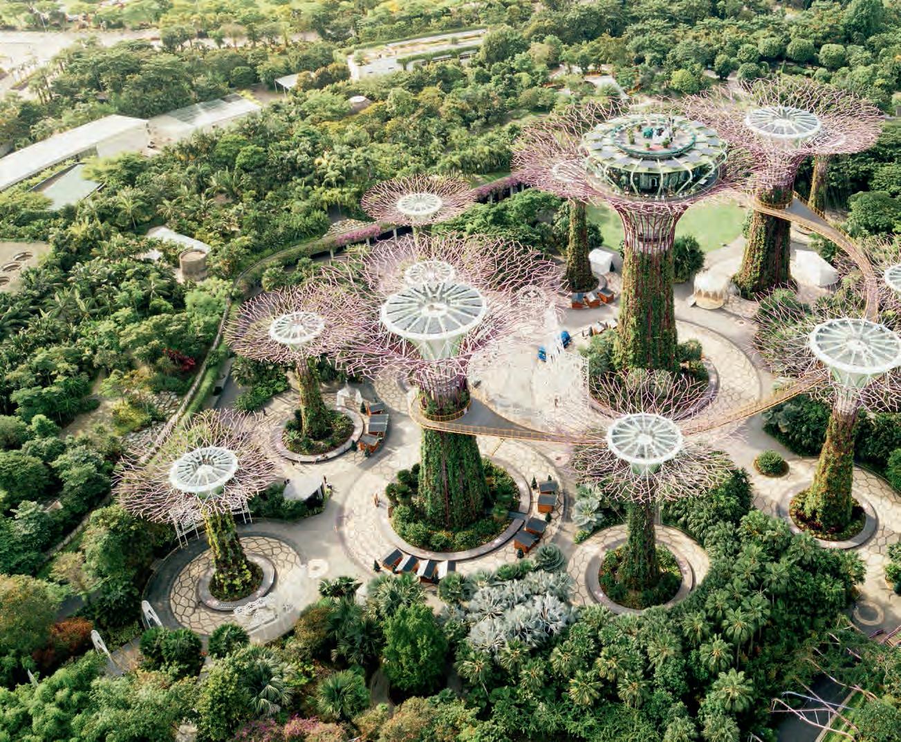 extend between 9 and 16 storeys tall. It’s possible to walk between the man-made trees on a suspended walkway and enjoy views over the impressive park.