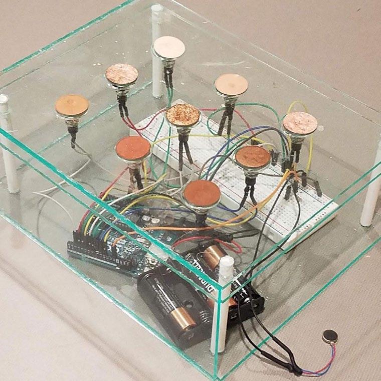 The palette works somewhat like a keyboard. As a user presses a shade, a signal is sent to the speaker, announcing the shade’s name. As users go down the palette and the color of the shade intensifies, so too does the intensity of the vibrations from the palette. All of it is made possible by the designs and circuits built by Shreya and Sejal.