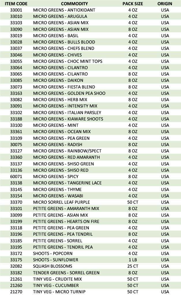 This list is subject to change. Items not listed can be special ordered and typically take about three business days to receive. Please note that seasonal and pre-order items are grown to order and have lead times of 1-3 months All of our specialty greens are proudly grown by Fresh Origins in the USA