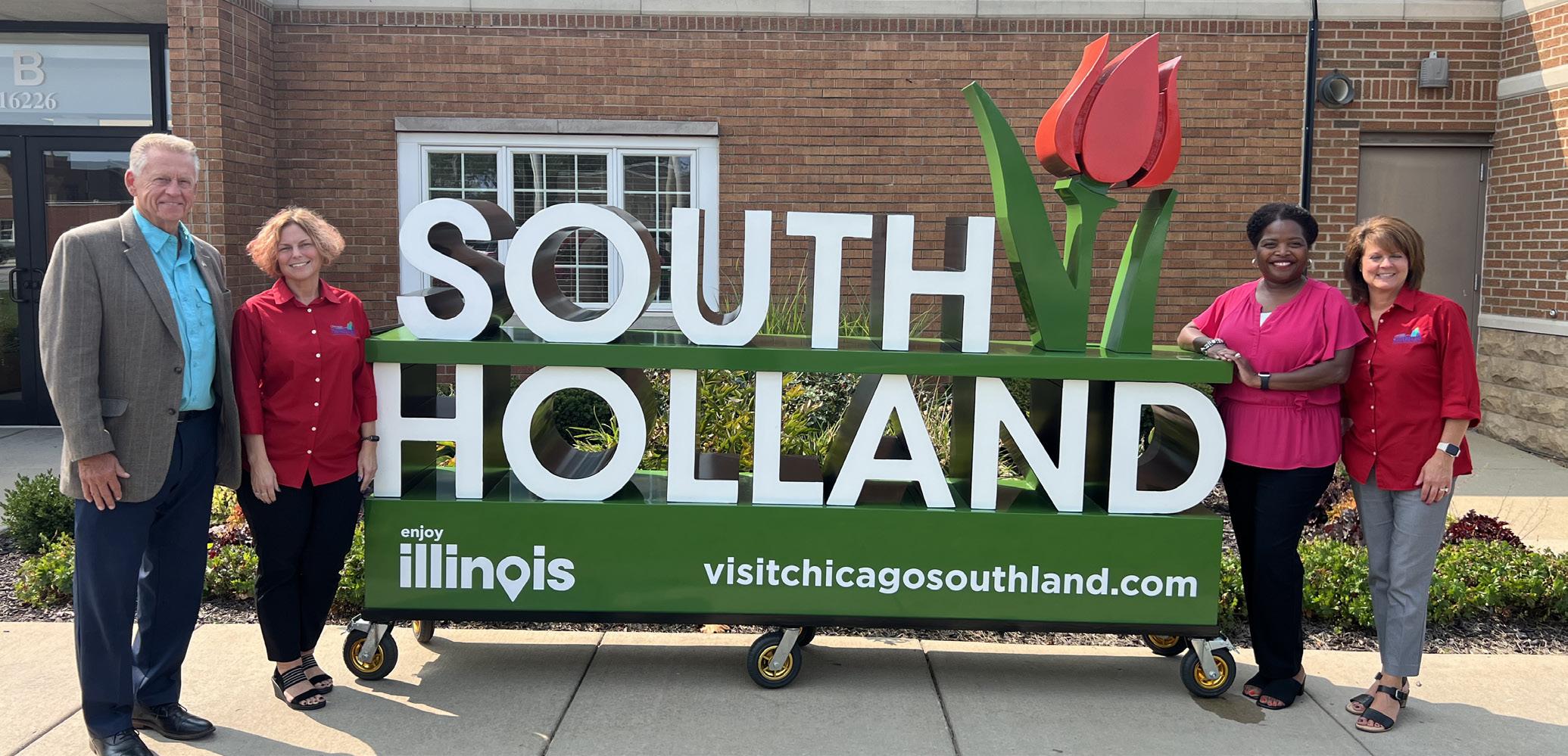 Mayor De Graff and Deputy Administrator Pat Mahon pose at the custom South Holland sign with Mary Patchin and Kim Kislowski of Visit Chicago Southland.