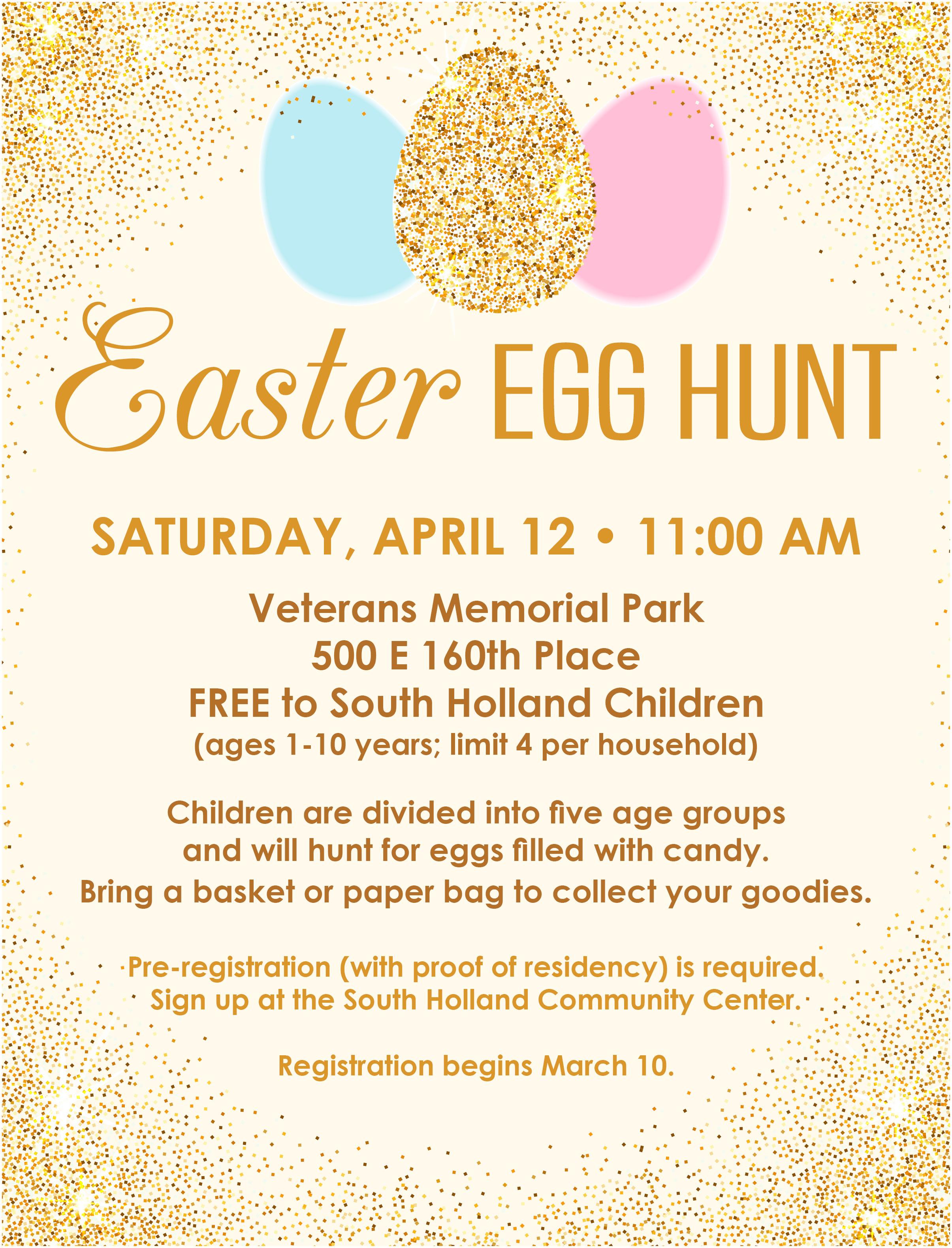 11am, Veterans Memorial Park, 500 E 160th Pl South Holland kids ages 1-10 years old are invited to our annual Easter Egg Hunt! Children are divided into five age groups and will hunt for eggs filled with candy. Bring a basket or paper bag to collect your goodies. Kids can also have their photo taken with the Easter bunny! This event is for South Holland residents. Pre-registration (with proof of residency) is required. Register at the South Holland Community Center.