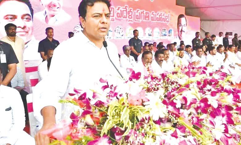 Wanaparthy: Telangana IT and Industries Minister, K T Rama Rao, declared that the Congress party represents tears, while BRS signifies irrigation water. Addressing a public meeting titled “Ten Years Progress of Wanaparthy” held here on Friday, KTR criticized the Congress party, referring to it as a party of guarantees without warranty that is currently in an ICU.He stated that the Congress party signifies migration, whereas BRS represents irrigation. According to KTR, if one believes in the Congress party, 24 hours of electricity will be lost, and only 3 hours of electricity are guaranteed.KTR urged Prime Minister Modi, who is visiting Palamuru, to grant national status to Palamuru Ranga Reddy and allocate 575 TMC of Krishna waters to Telangana. He questioned why Telangana remains an orbit for Modi. KTR expressed disappointment that the central government ignored two resolutions sent regarding ST status for Valmiki Boyas.KTR asserted that Palamoor was neglected until their flag was raised. He accused that no Chief Minister paid attention when 14 lakh people were migrating from the