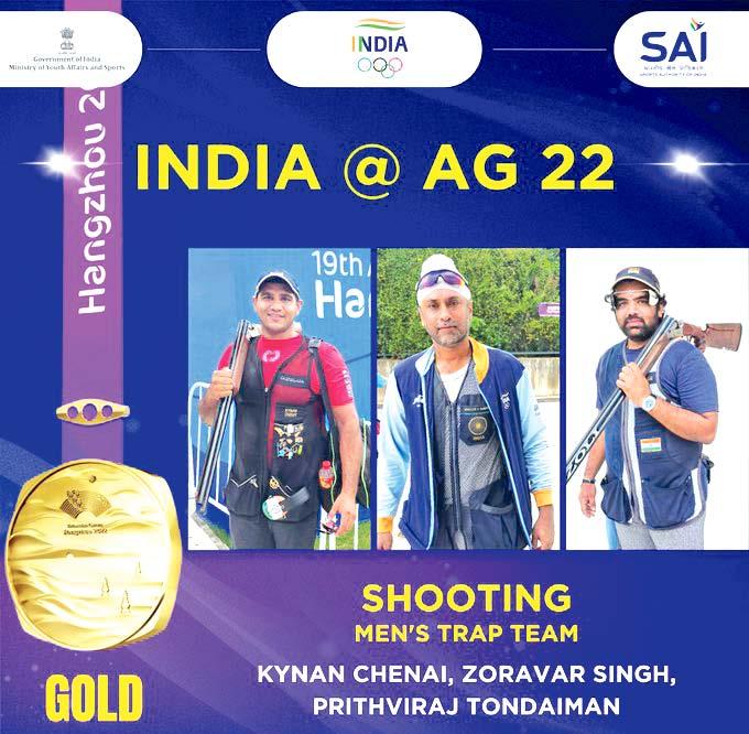 als in the men's and Women's individual competitions. The Men's Trap team of Kynan Chenai, Zoravar Singh Sandhu and Prithviraj Todaiman bagged the gold medal with a Games Record score of 318 as it finished ahead of Kuwait and China, who took silver and bronze medals with scores of 358 and 354 respectively.