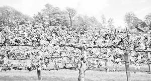Espalier is a method of pruning that does not pay attention to the normal form of growth. It is the art of training woody plants to branch in more formal patterns along a wall, fence or trellis. It actually dates back to medieval times when the monks would grow fruit trees along the walls of the gardens to best utilize the limited space available. Growing these trees in a less natural two-dimensional form results in very little loss of growing area.