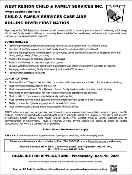 Serving Erickson, Onanole, Sandy Lake and Areas Inc. Invites Applications for the position of: