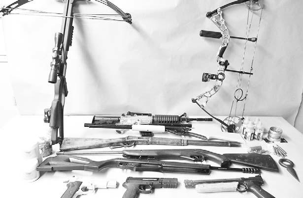 On July 16, The Pas RCMP officers conducted a traffic stop on a vehicle located in the community. In speaking with the male driver and two female passengers, officers noted open liquor within the vehicle. A further search of the vehicle led to the seizure of a substance believed to be cocaine, an extendable baton and bear mace. As a result of this investigation, officers prepared and executed a search warrant at a rural property located off of Highway 10, north of The Pas. As a result of this search, officers seized a number of firearms, airsoft guns, a crossbow, body armour, illicit pills and other drug-related paraphernalia. RCMP have arrested the three individuals who remain in police custody. Charges for the three accused, a 30-yearold male and a 27-year-old female, both from The Pas, as well as a 36-year-old female, from Opaskwayak Cree Nation, are pending. The Pas RCMP continue to investi-