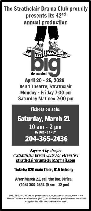 It’s hard to believe but not everyone has Facebook. This ad you’re reading costs $13.50 and reaches over 5 communities and 3,000 readers every week. And next week it will be half price. Planning an event? If you tell them they WILL come. Call Michelle at 204759-2644 ext. 1.